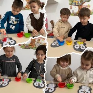 Воспитатель провела дидактическую игру: "Подбери цвет пингвину".