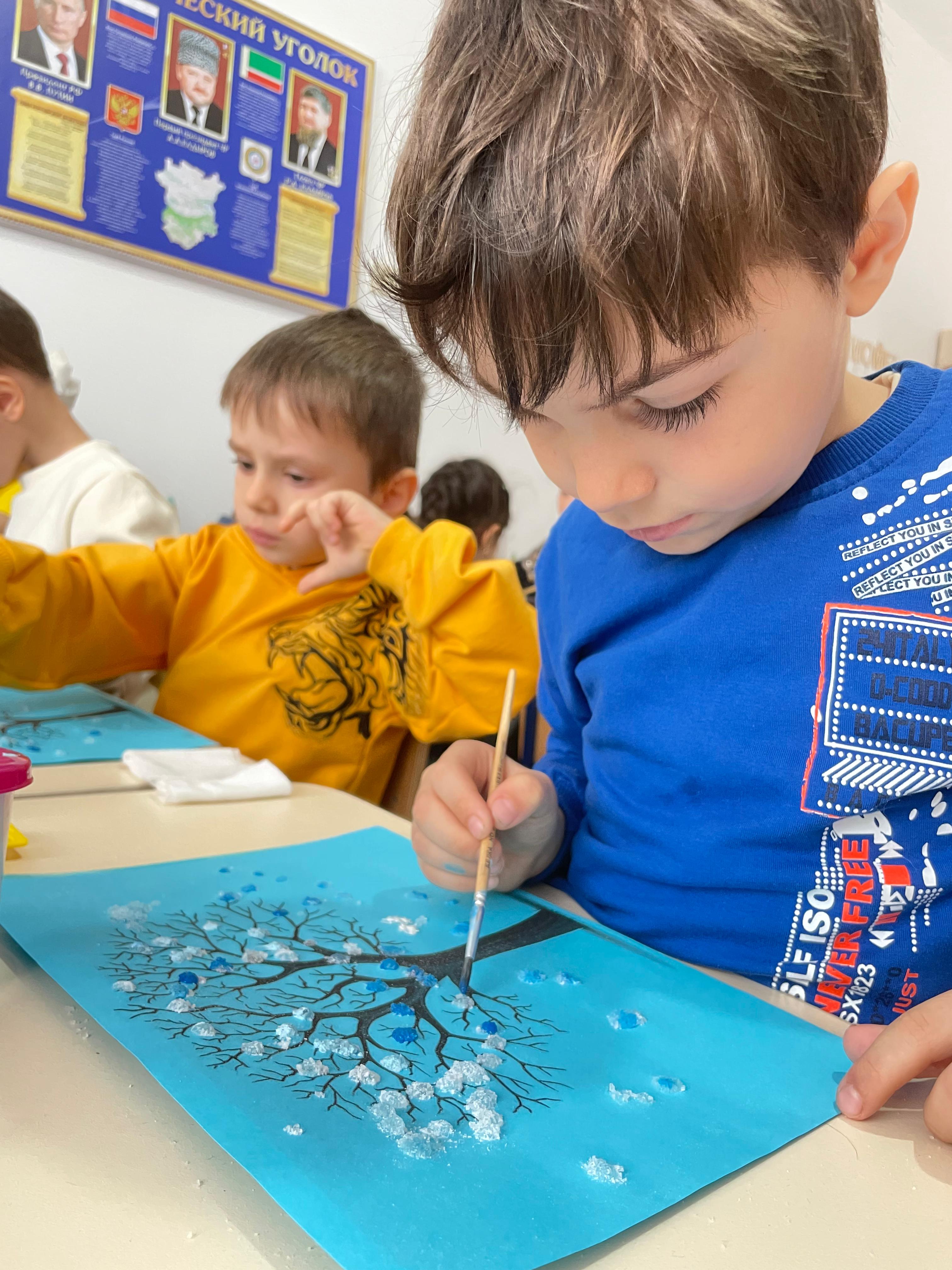 Цель: Формировать умение передавать в рисунке зимнее дерево при помощи гуашевых красок и соли.